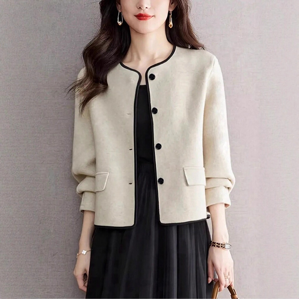 欧美外贸2025独立站小香风毛呢外套女春秋冬季圆领短款开衫外套