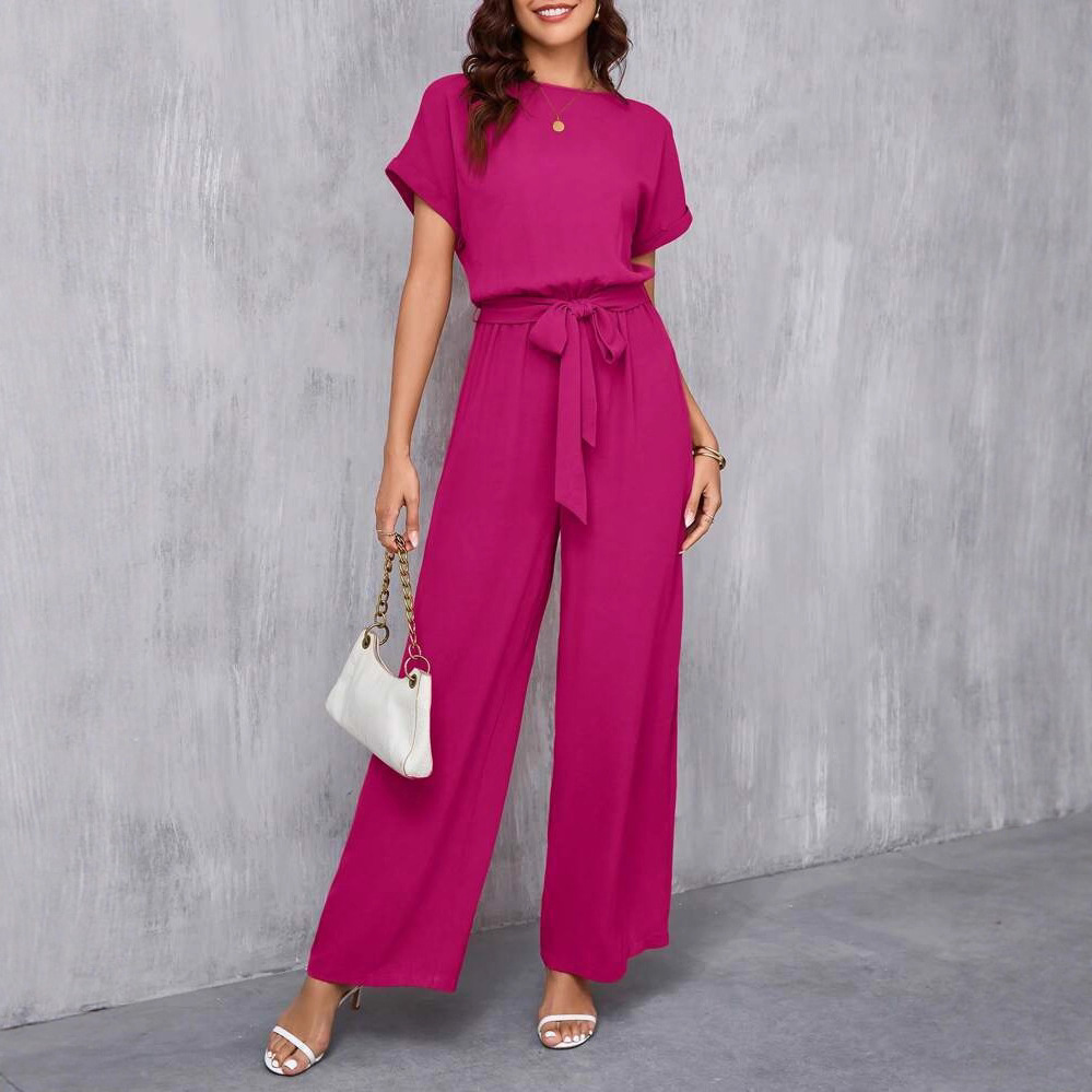 欧美2025亚马逊wish独立站跨境新款高腰通勤收腰绑带连衣裤长裤女