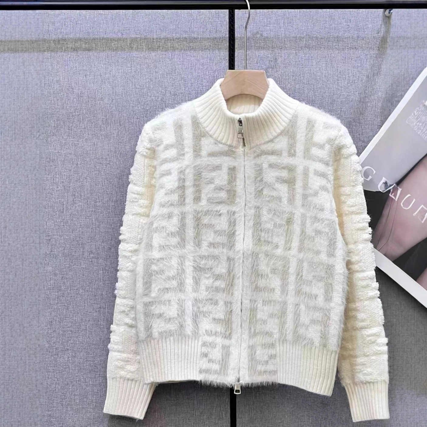 南油25秋冬新款水貂毛立领提花F字母拼接拉链针织开衫女外套