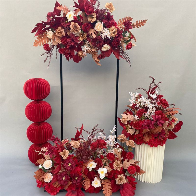 婚庆地排花红色中式订婚宴布置婚礼堂舞台路引花婚庆绢花排仿真花