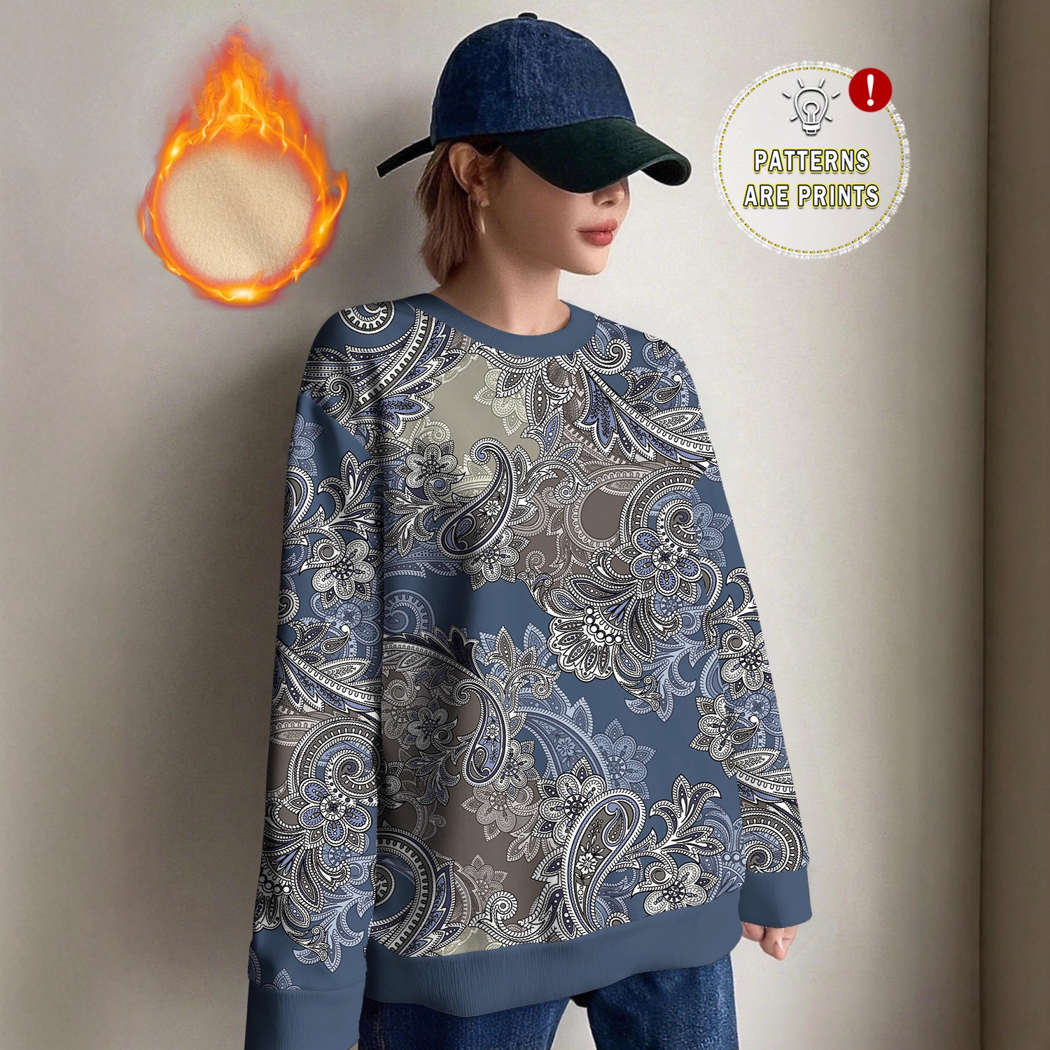 跨境欧美新款秋冬女装圆领复古提花印花图案休闲宽松卫衣女秋外套