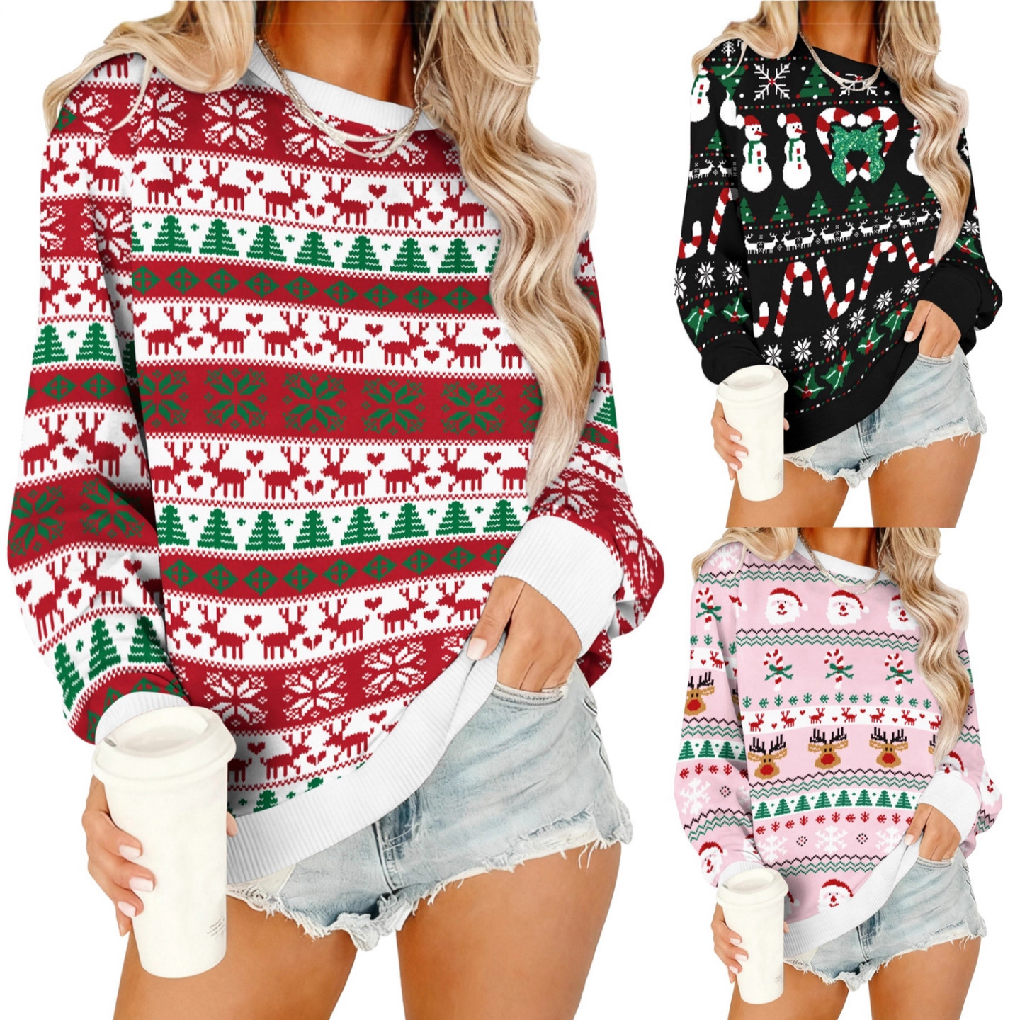 跨境新款秋冬季女装圣诞节印花卫衣套头抓绒长袖圣诞卫衣套装女秋