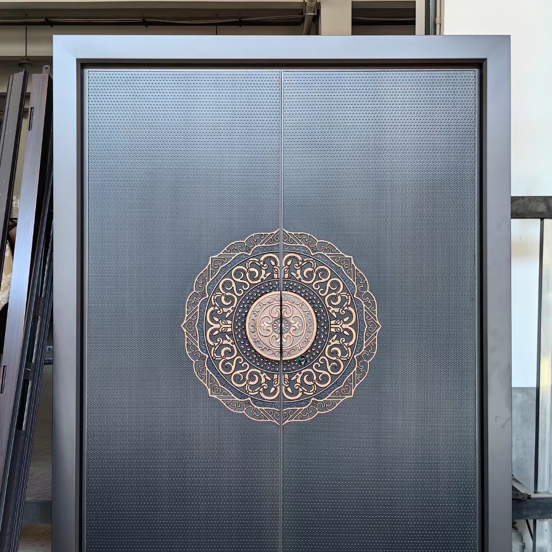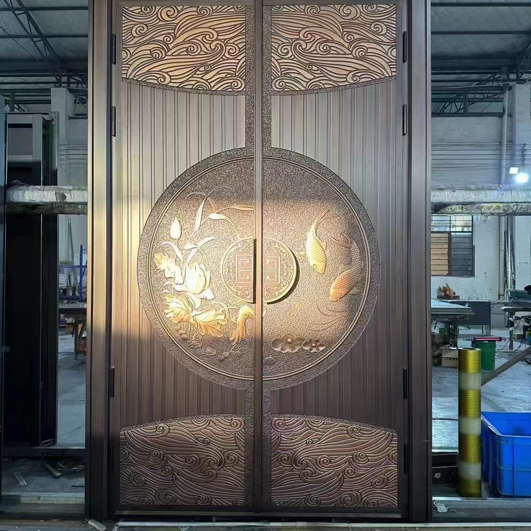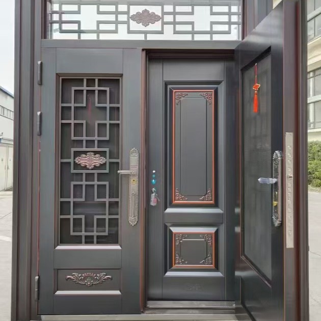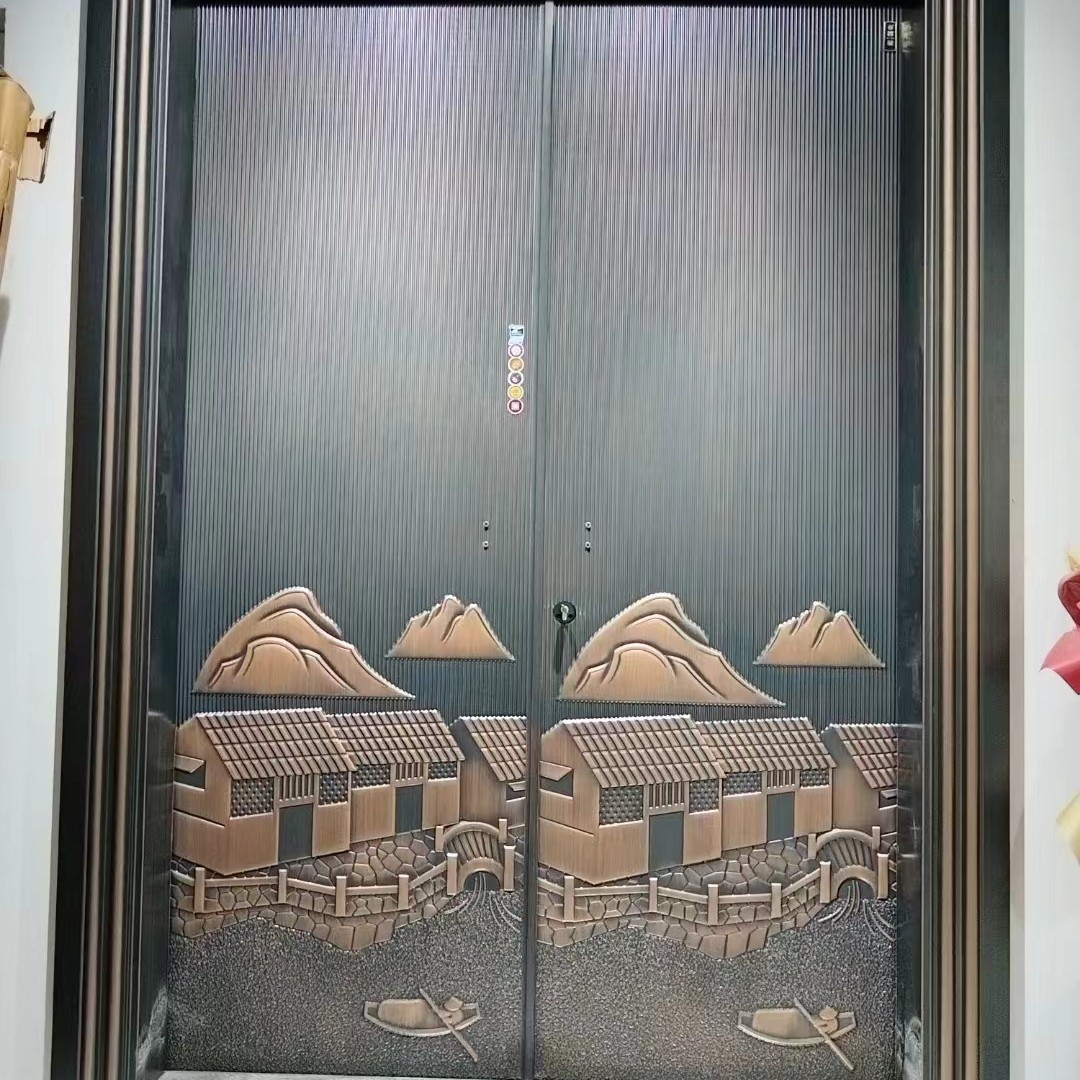 新中式风格精雕铸铝门前后双色正面精雕滑盖拉手防盗门入户门大门
