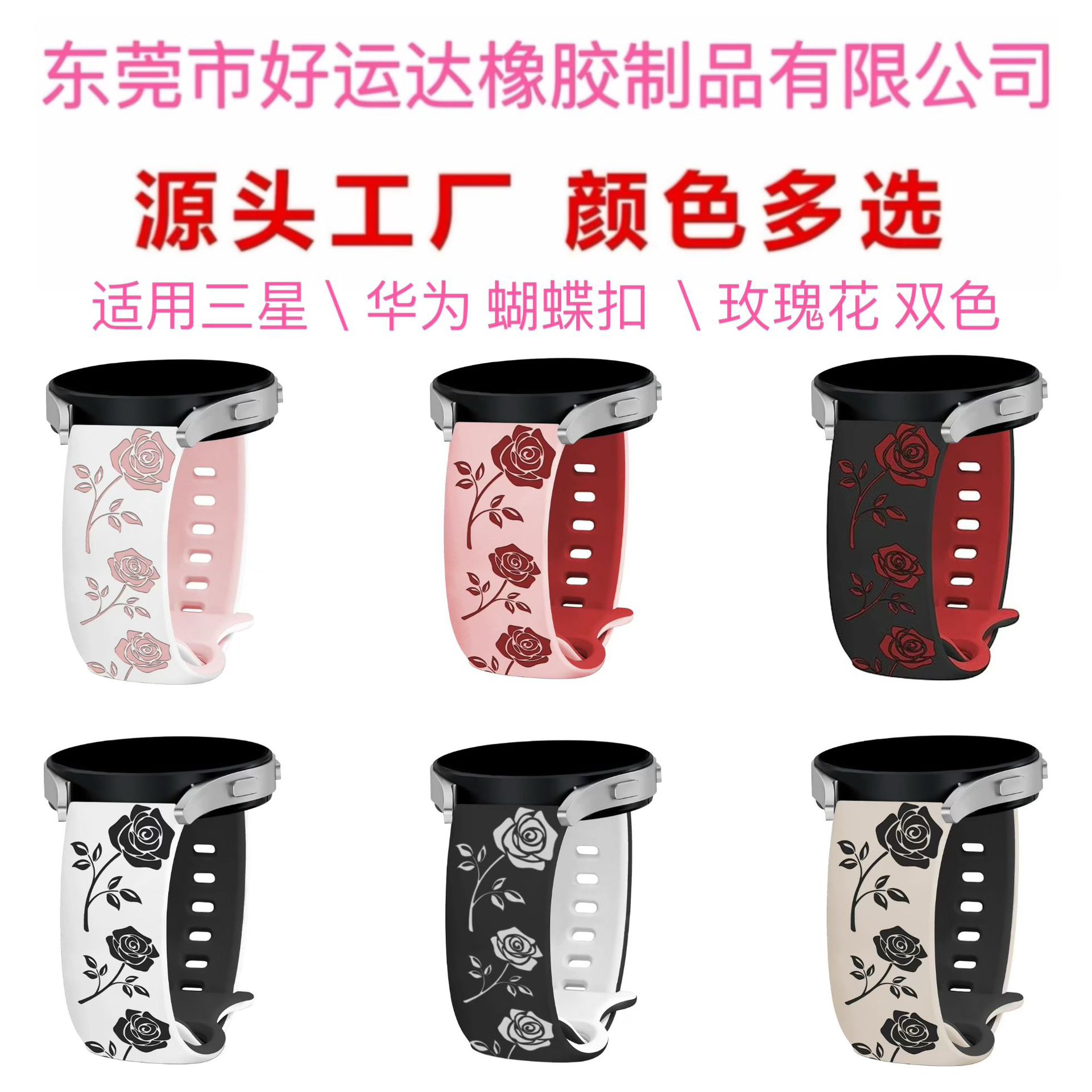 适用三星华为双色玫瑰花平头蝴蝶扣双色雕花表带GalaxyWatch表带