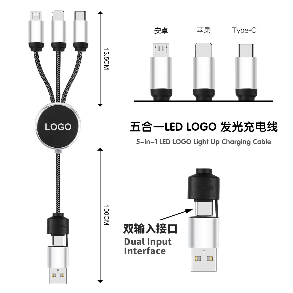 跨境创意发光三合一数据线定 制logo钥匙扣双输入三合一充电线