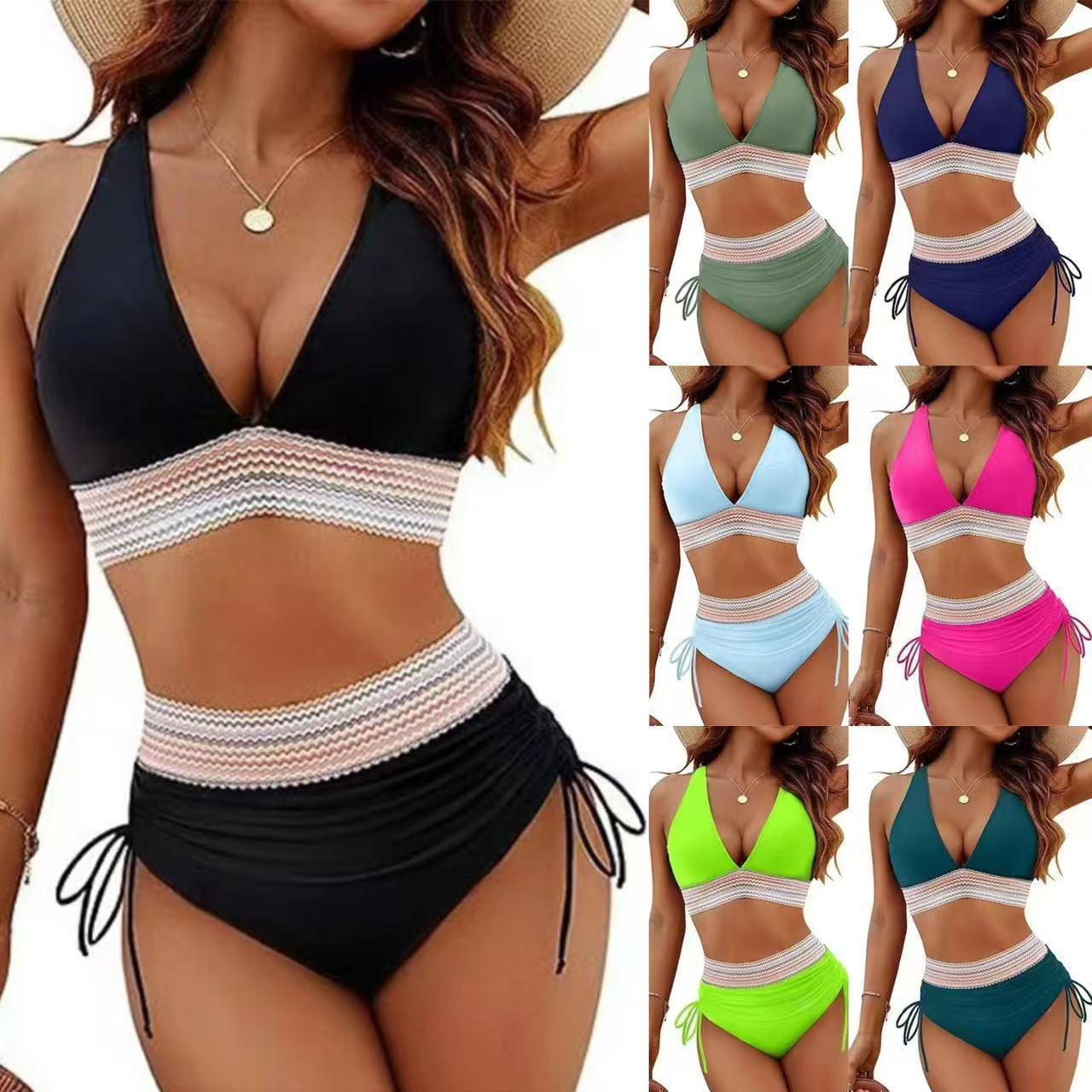2025跨境新款欧美高腰分体条纹织带性感比基尼bikini多色温泉泳装
