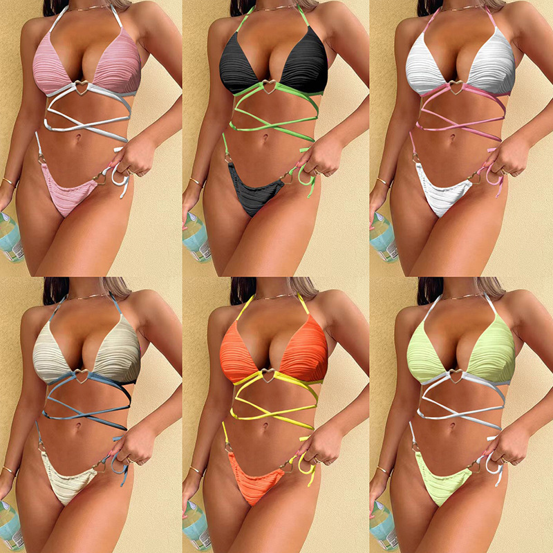 2025欧美性感爱心抽绳绑带硬杯比基尼女泳装跨境外贸速卖通亚马逊