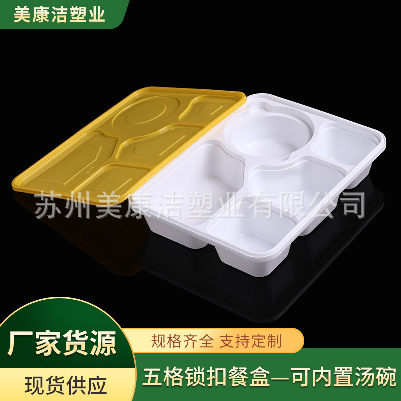 一次性塑料餐盒正方形五格乳白色底黄盖微波冷藏锁扣可配汤碗饭盒