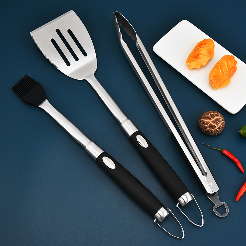 BBQ食物夹四件套装烧烤扫烧烤铲带牙刀手柄包橡塑户外烤具不锈钢