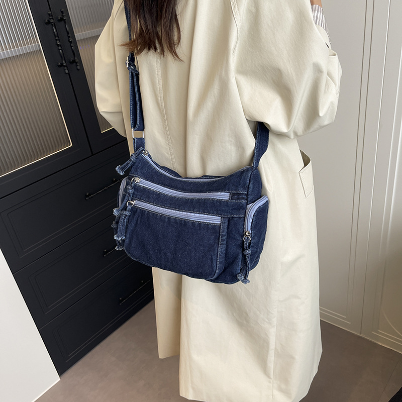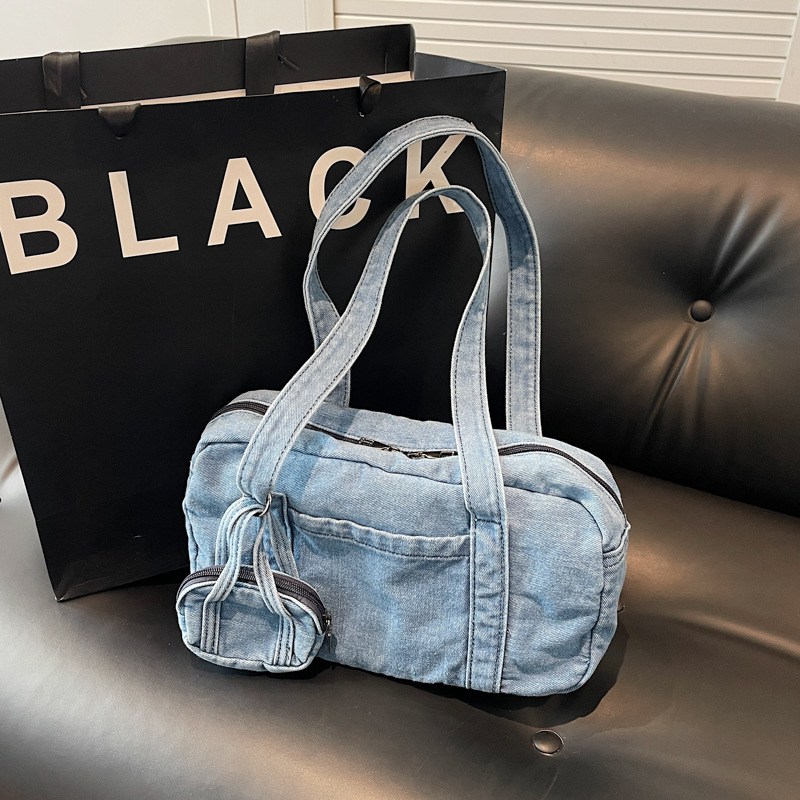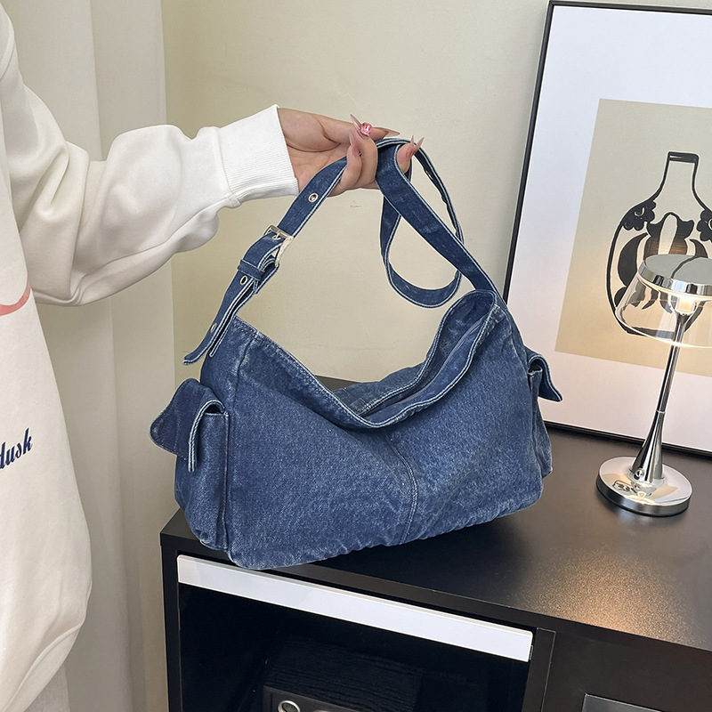 新款牛仔布托特包时尚百搭单肩包多口袋通勤斜挎包纯色大容量包女