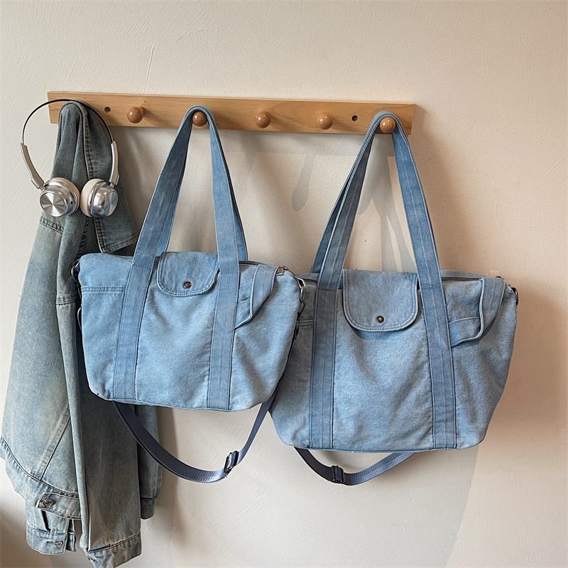 新款大容量纯色牛仔布托特包时尚日系百搭单肩包通勤复古帆布包女