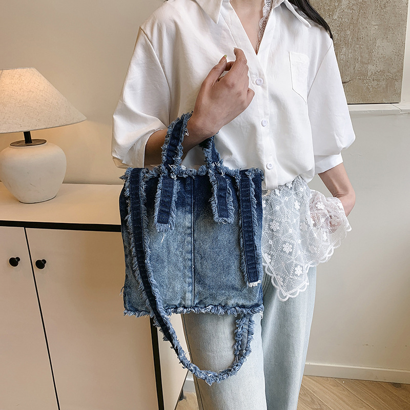 牛仔布流苏包女简约时尚流浪风单肩斜挎包水洗帆布渐变辣妹托特包