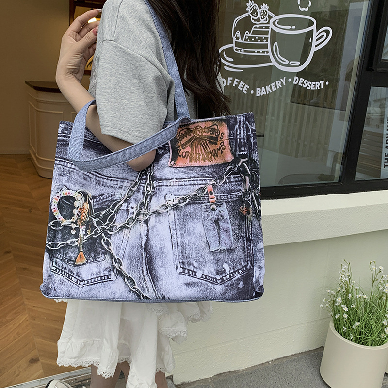 牛仔布托特包网红同款数码喷涂帆布单间包包女韩版跨境复古斜挎包
