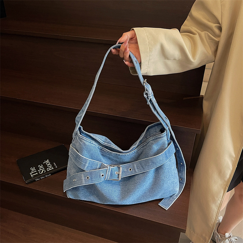 新款牛仔布托特包腰带装饰欧美跨境复古单肩包潮流休闲腋下包包女