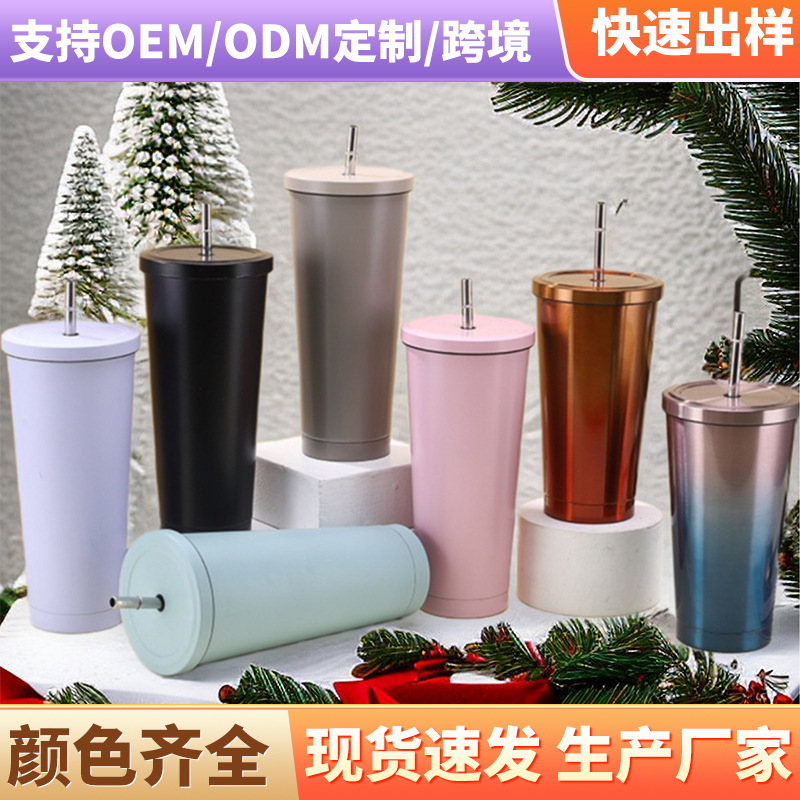 吸管金边保温杯创意真空吸管杯户外车载便携随 行咖啡杯