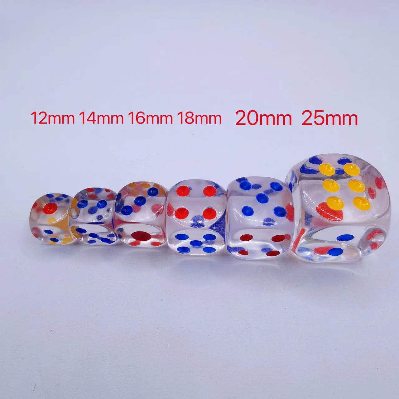 现货各种大小规格透明水晶骰子 亚克力透明筛子 圆角透明彩点骰子