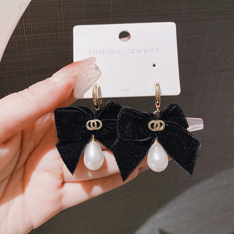 黑色植绒蝴蝶结耳钉女2024新品潮设计感耳环小众设计珍珠百搭耳饰