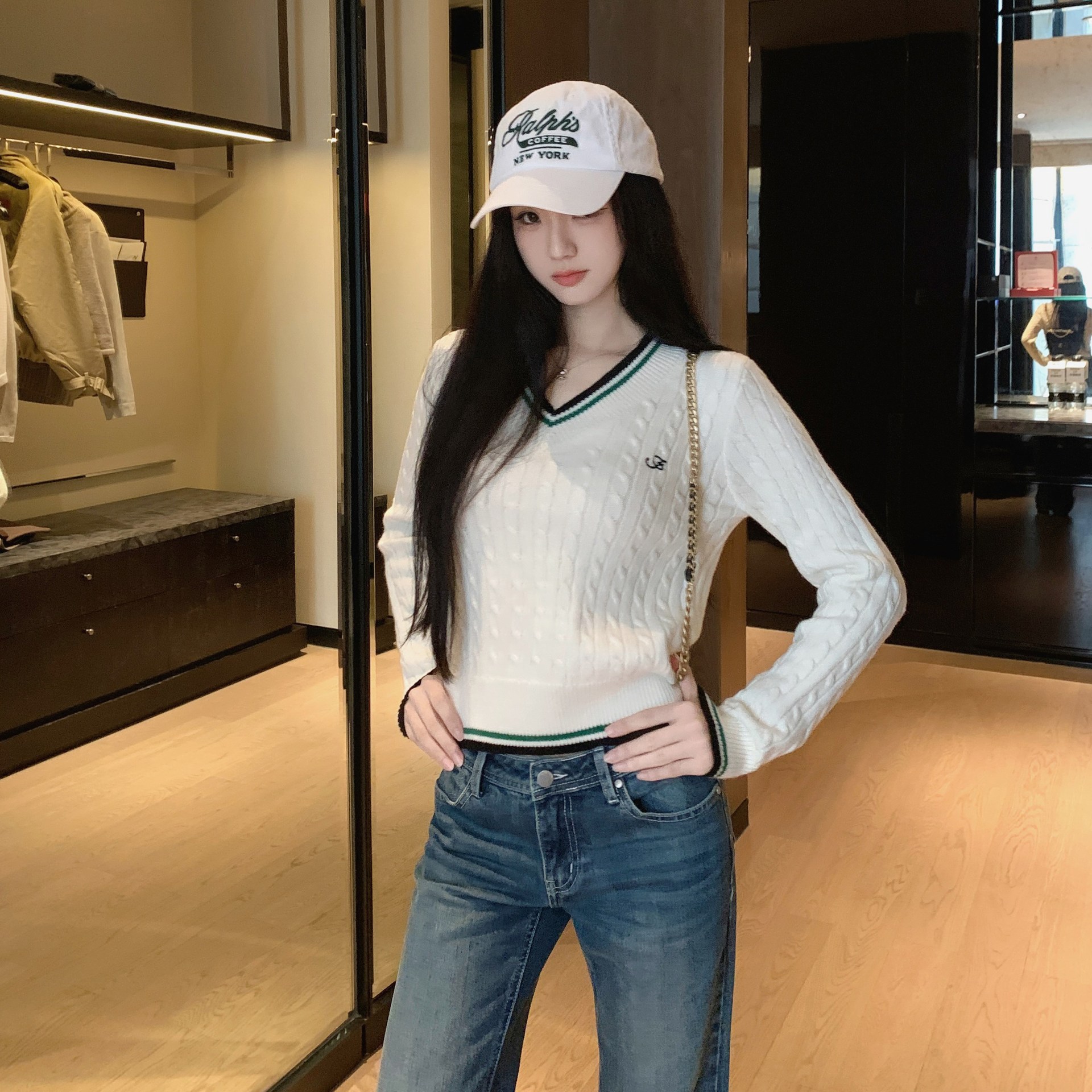 深圳南油CD家高版本25秋冬新款五角星撞色字母镂空圆领长袖针织衫