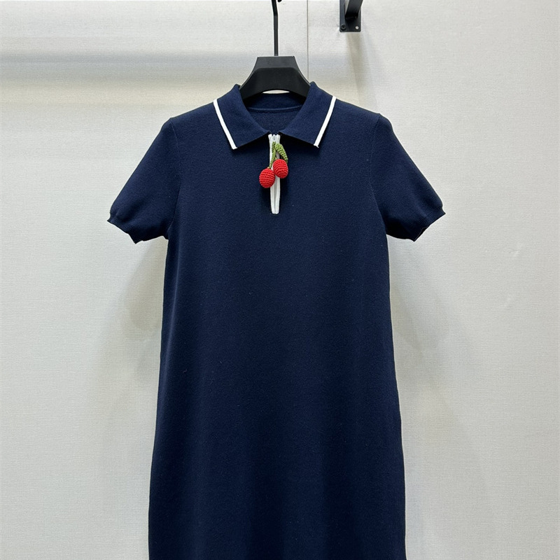 南油高定v家25早秋简约白色领口撞色红色樱桃吊坠polo连衣裙