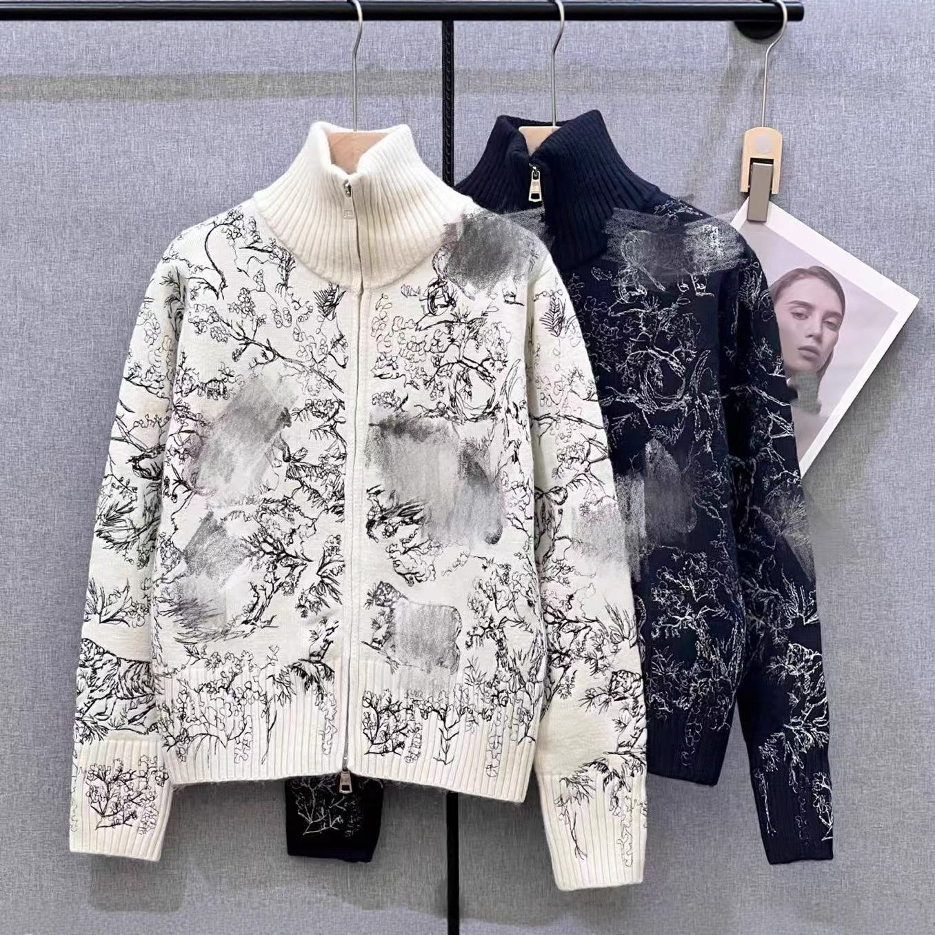 南油高定D家25年秋冬新款满印连帽开衫双面穿拉链针织外套