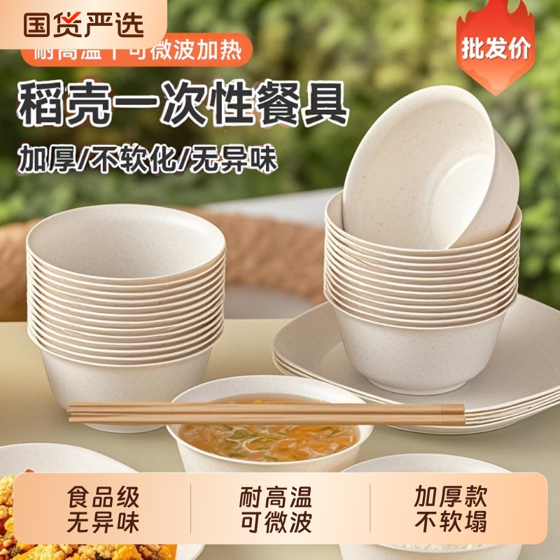 稻壳一次性饭碗碗筷餐具食品级家用的加厚耐高温聚餐盘子套装户外