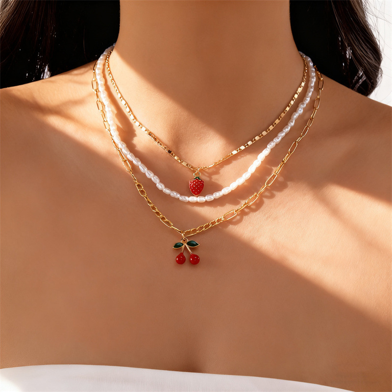 跨境爆款饰品项链时尚轻奢高级感多层仿珍珠樱桃草莓手链锁骨链女