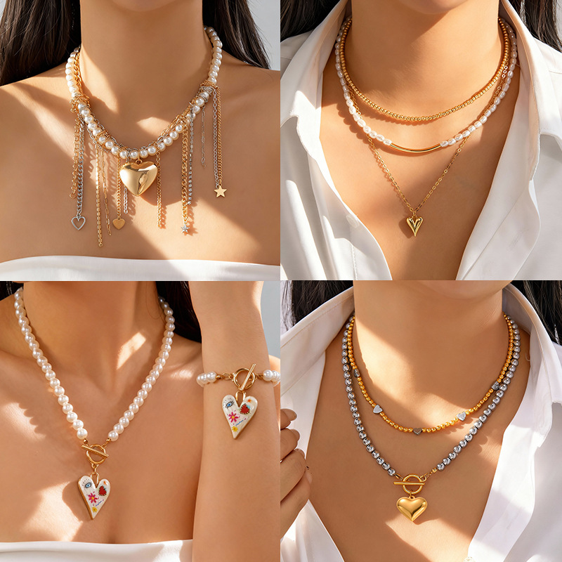 欧美跨境热销项链女夸张个性潮流爱心日月仿珍珠叠戴式锁骨链饰品