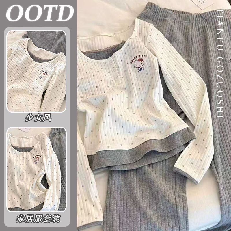 韩版KT猫撞色假两件睡衣女带胸垫坑条长袖春秋季可外穿家居服套装