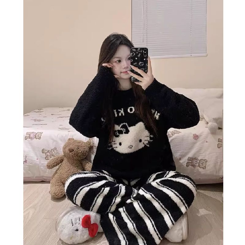 日系可爱豹纹凯蒂猫珊瑚绒睡衣女款秋冬季加绒加厚大码家居服套装