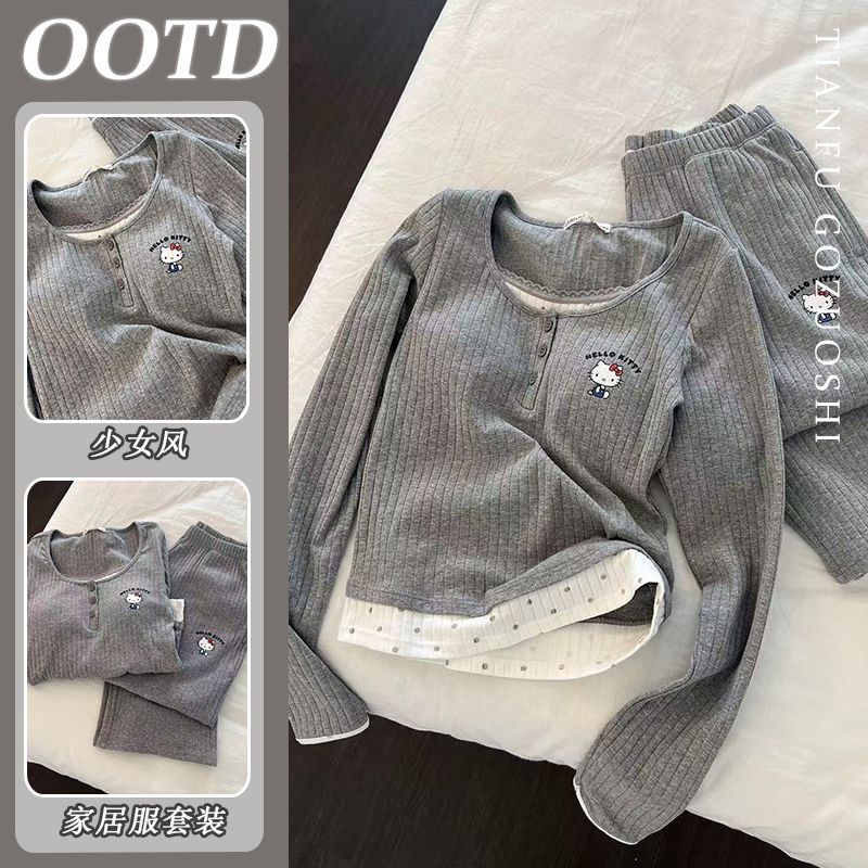 韩系凯蒂猫半边绒睡衣女2025新款秋冬季加绒加厚珊瑚绒家居服套装