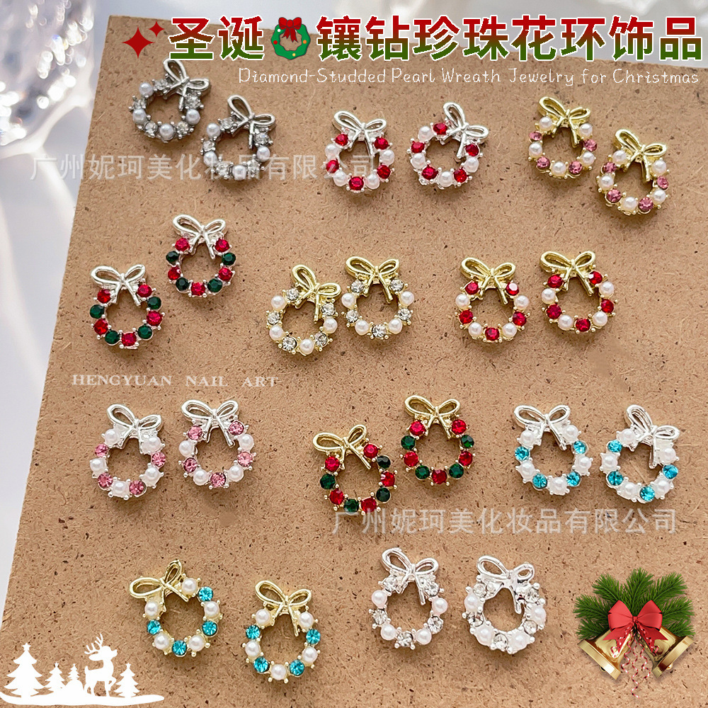 新款圣诞精致花环蝴蝶结合金美甲饰品超闪镶钻珍珠指甲装饰贴批发
