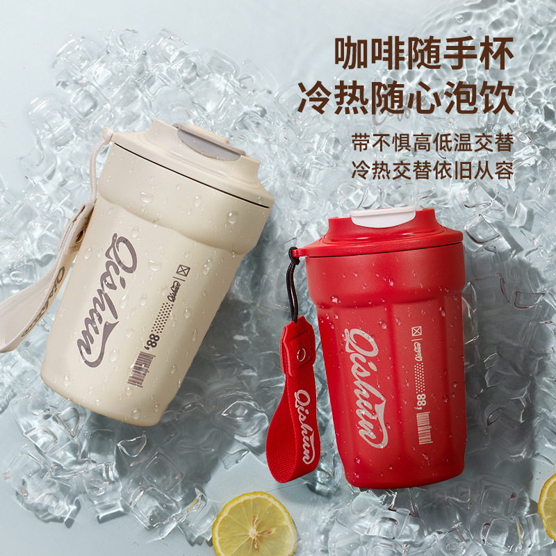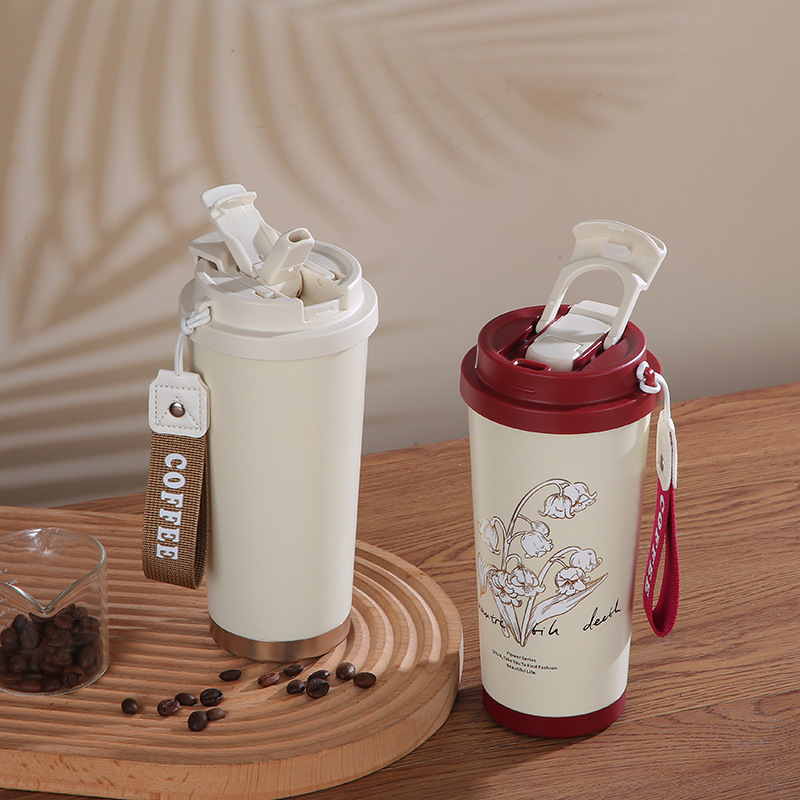 定制316不锈钢铃兰花咖啡杯便携陶瓷内胆保温杯户外带提绳吸管杯
