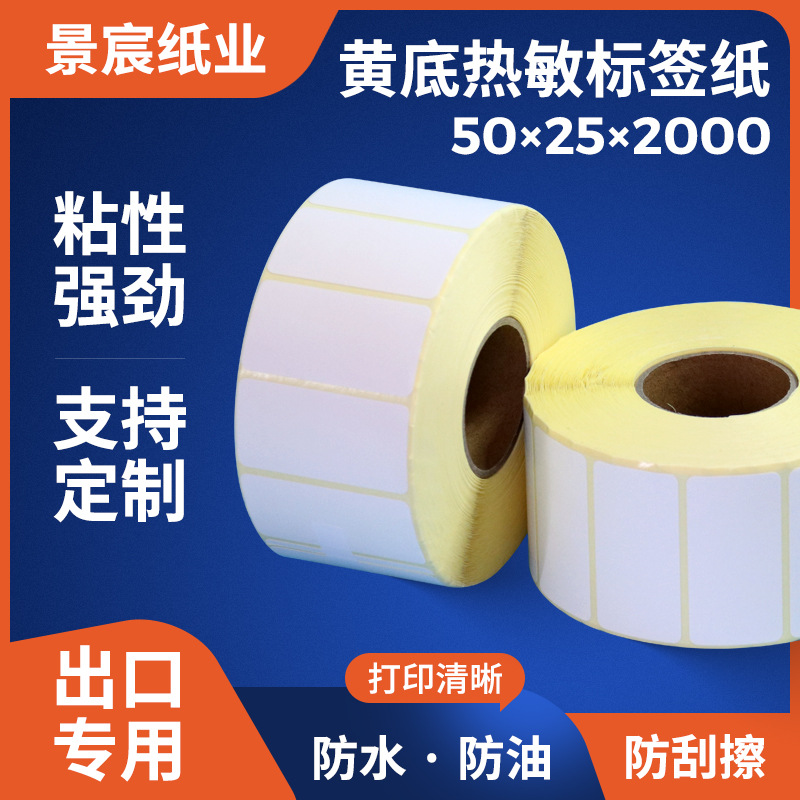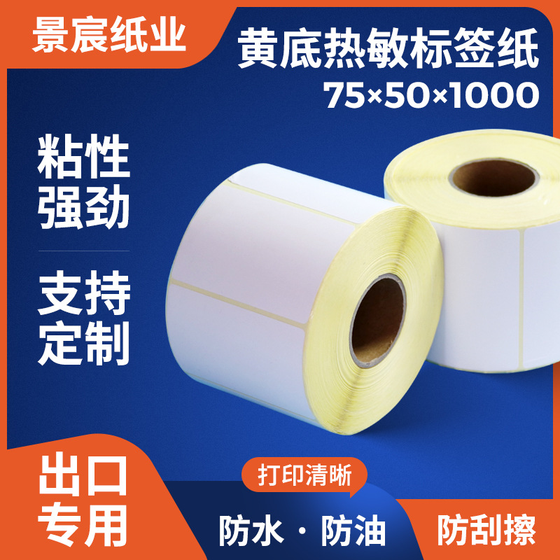 出口专供黄底热敏标签打印纸75x50x1000超市商品三防不干胶打印纸