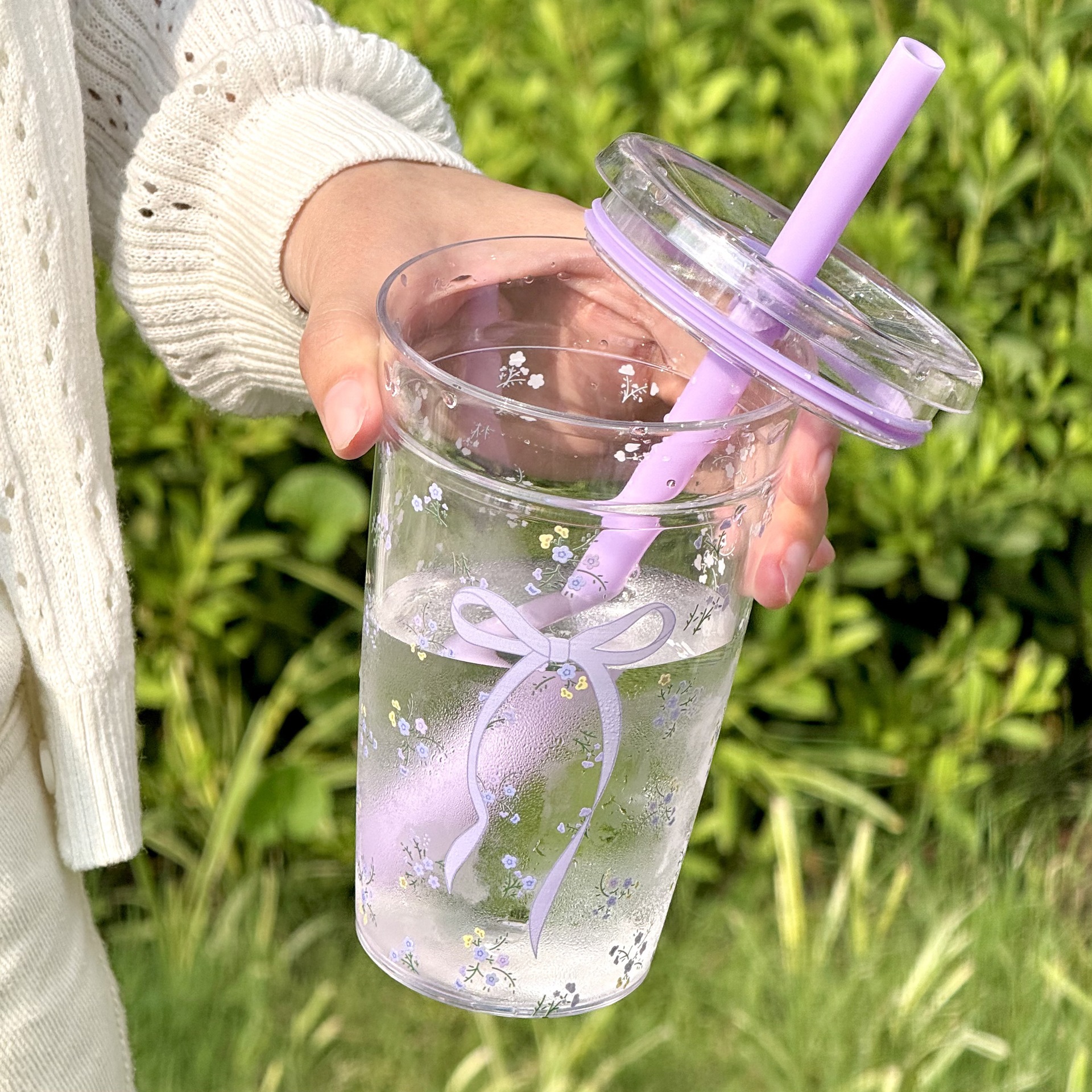 夏日可爱蝴蝶结小碎花透明喝水杯子冷饮牛奶咖啡杯情侣杯塑料杯
