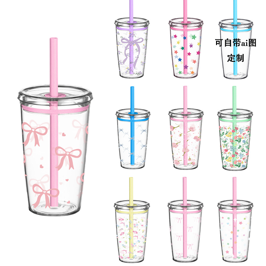 2025新款450ml花朵吸管杯奶茶杯咖啡杯带印刷简约吸管水杯