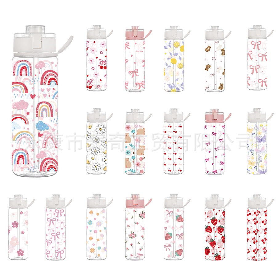 可爱卡通印花弹跳盖水杯夏季带吸管运动塑料水壶随身杯子