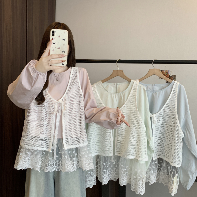 2026春季新款大码女装糖果色遮肚显瘦休闲套装蕾丝马甲衬衫两件套