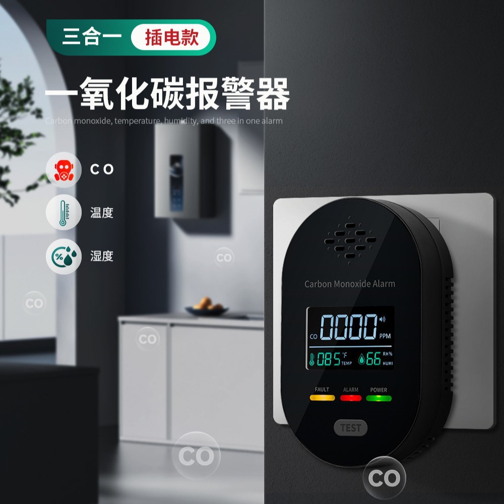 新品爆款 插电式带温湿度三合一探测仪LCD大屏显示一氧化碳报警器