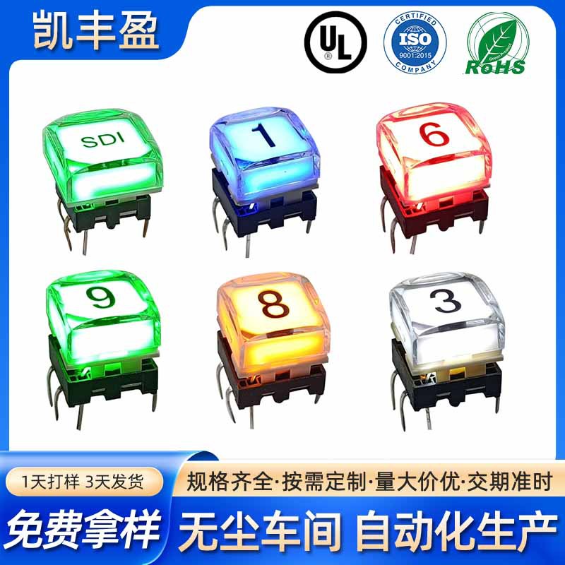 插件轻触开关 6X6X9侧按键带灯轻触开关镭雕键帽耐温90度弯脚卧式