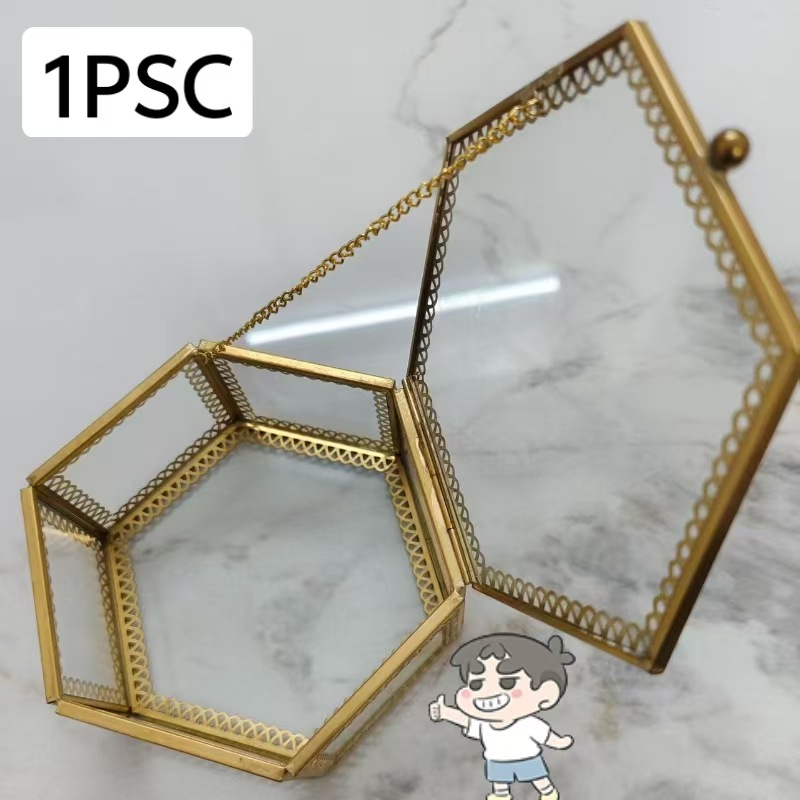 奢华六边金色+透明玻璃迷你珠宝首饰盒 桌面首饰收纳盒做精致女生