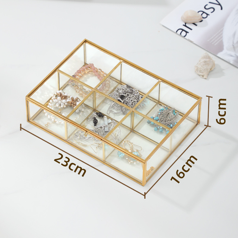开合封闭式跨界热销6格珠宝首饰化妆品玻璃收纳盒金色铜质边框