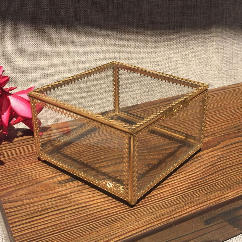 新款正方形迷你珠宝首饰化妆品加厚玻璃盒 金色边框+透明玻璃桌面