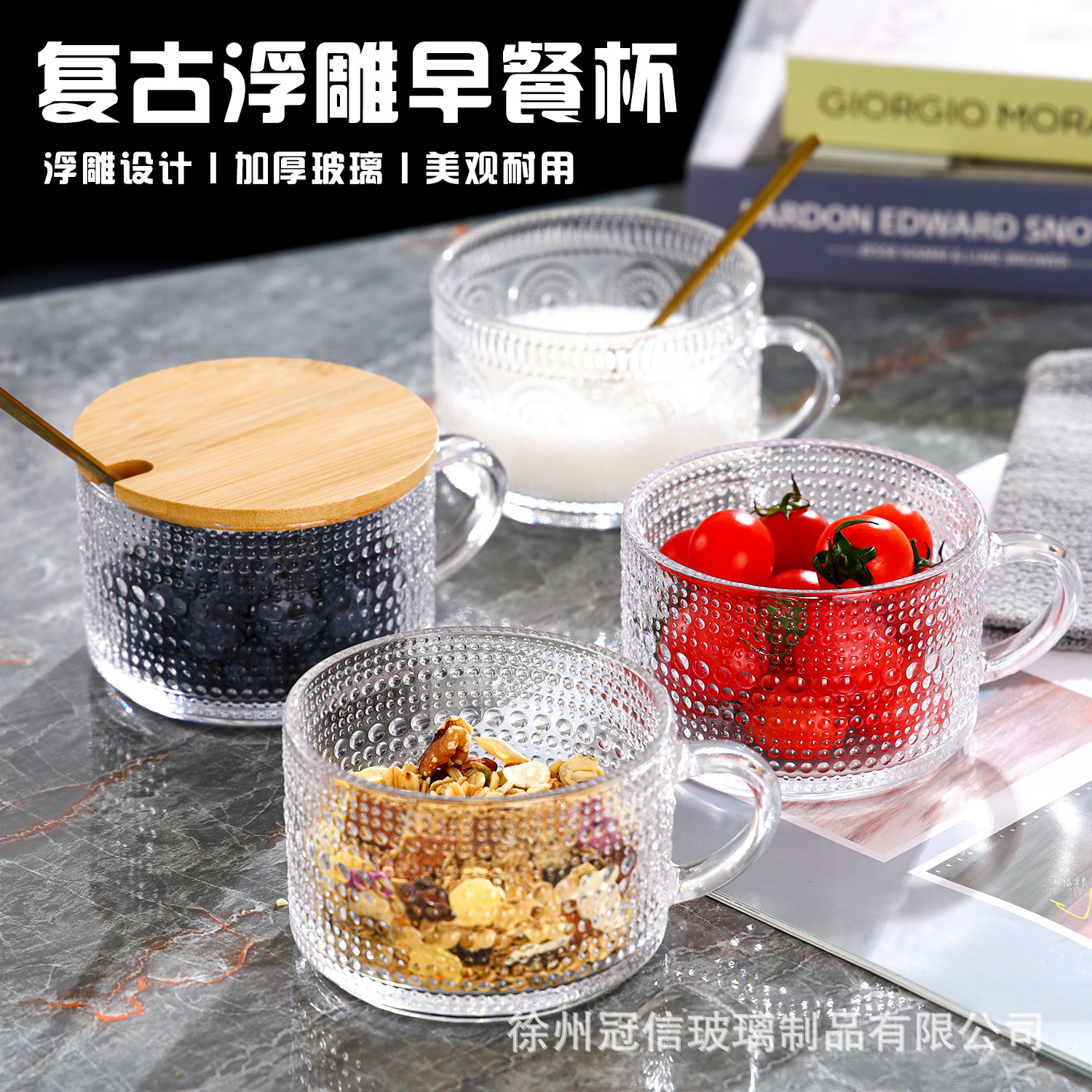 浮雕复古太阳花玻璃燕麦杯把手早餐杯透明玻璃牛奶带勺带盖咖啡杯