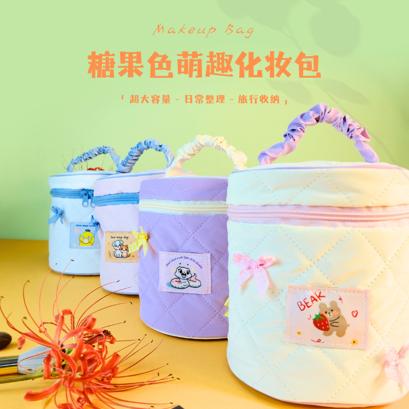 萌趣卡通新款手提化妆包 大容量便携绗缝羽绒包 可爱伴手礼水桶包