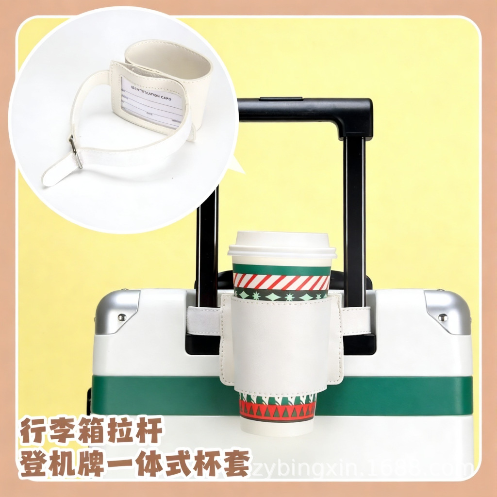 时尚便携行李牌杯套行李箱拉杆登机牌杯套行李牌一体皮套饮料杯架