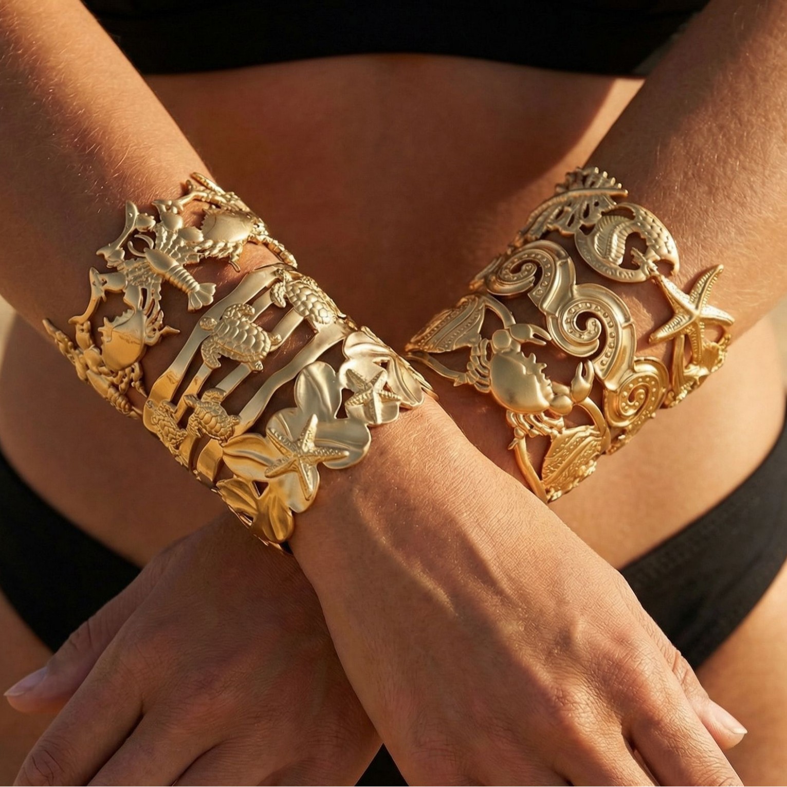 跨境新款18K金油压不锈钢手镯 度假风海星海螺海龟不掉色开口手镯