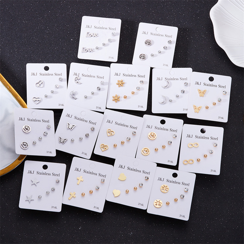temu跨境爆款 3对装不锈钢爱心蝴蝶组合耳环简约通勤纸卡耳钉套装