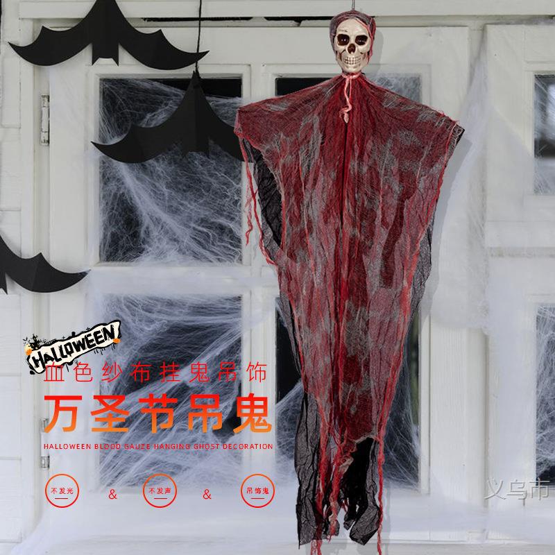 万圣节挂鬼吊饰染血恐怖骷髅头布置装饰道具血色纱布场景门廊露台