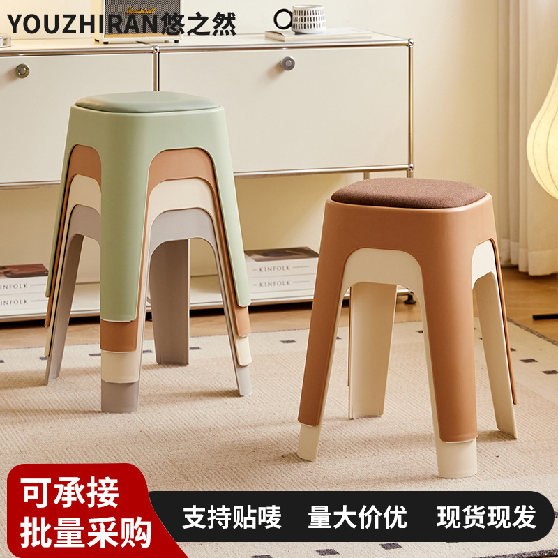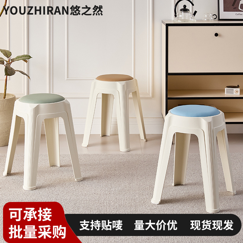 批发家用可叠放塑料软包凳子加厚圆凳简约高板凳结实客厅餐桌凳子