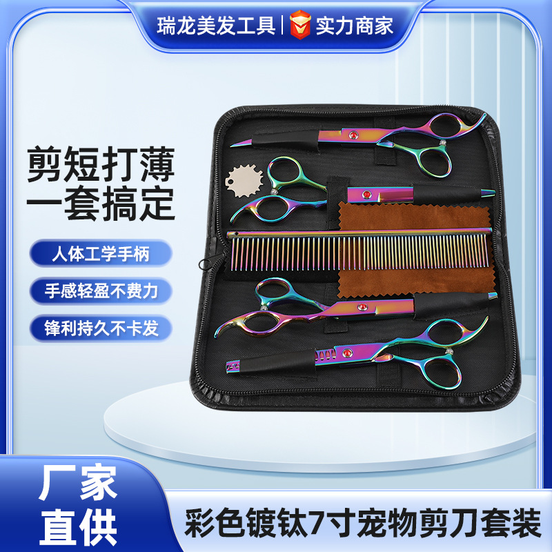 新款彩色镀钛7寸宠物剪刀套装猫狗通用剪刀梳子宠物清洁工具